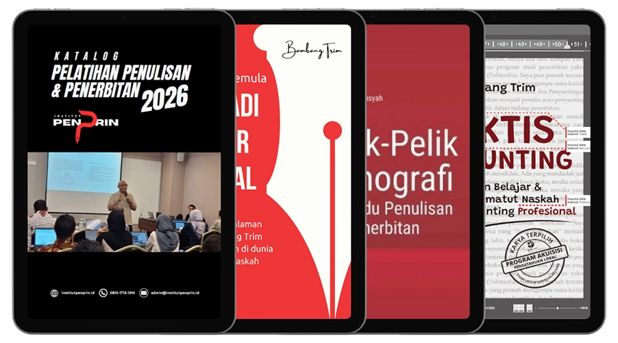 Dapatkan ebook bertema penulisan dan penerbitan karya Master Tutor Bambang Trim dan katalog pelatihan penulisan & penerbitan terbaru dari Institut Penprin.