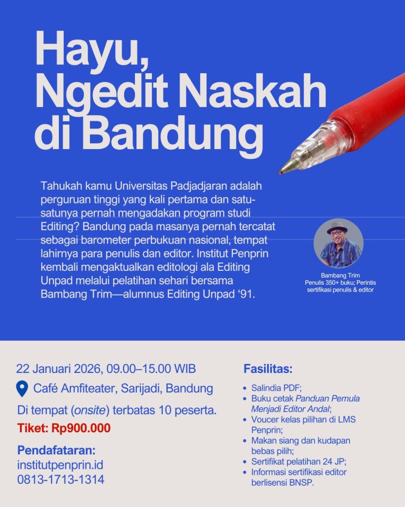 Tanggal 22 Januari 2026, Sabtu, menjadi pilihan kegiatan di Bandung. Peserta dibatasi hanya 10 orang agar pelatihan lebih efektif. Peserta juga akan mendapatkan buku cetak Panduan Pemula Menjadi Editor Andal karya Bambang Trim seharga Rp80.000 dan mendapatkan voucer pelatihan via LMS Penulisan Buku Nonfiksi seharga Rp600.000.