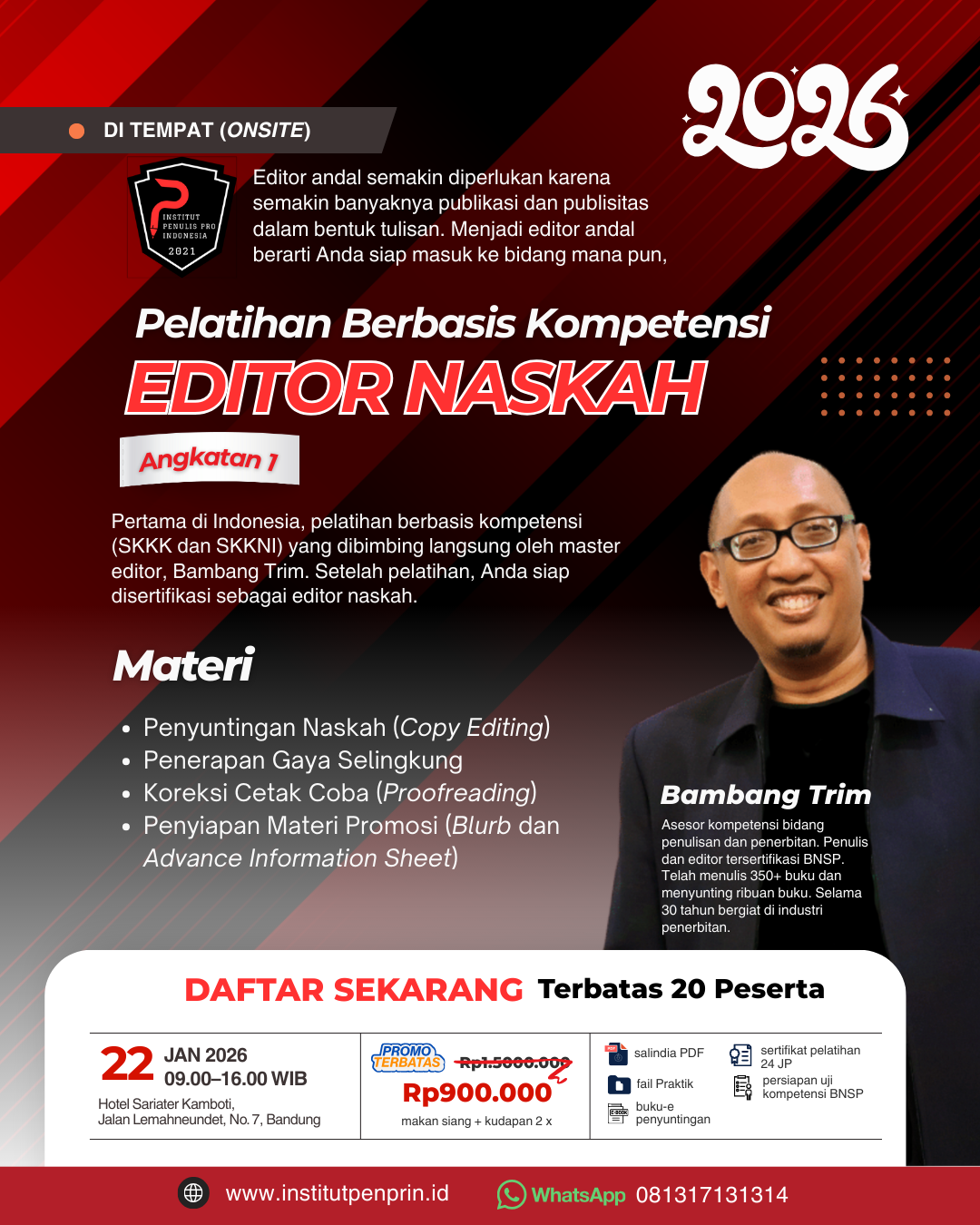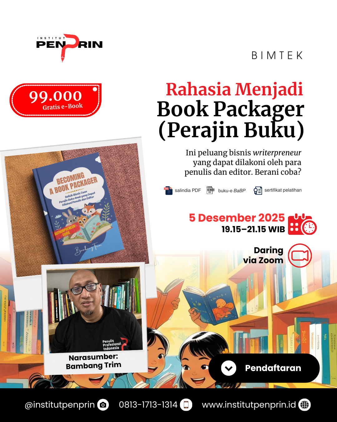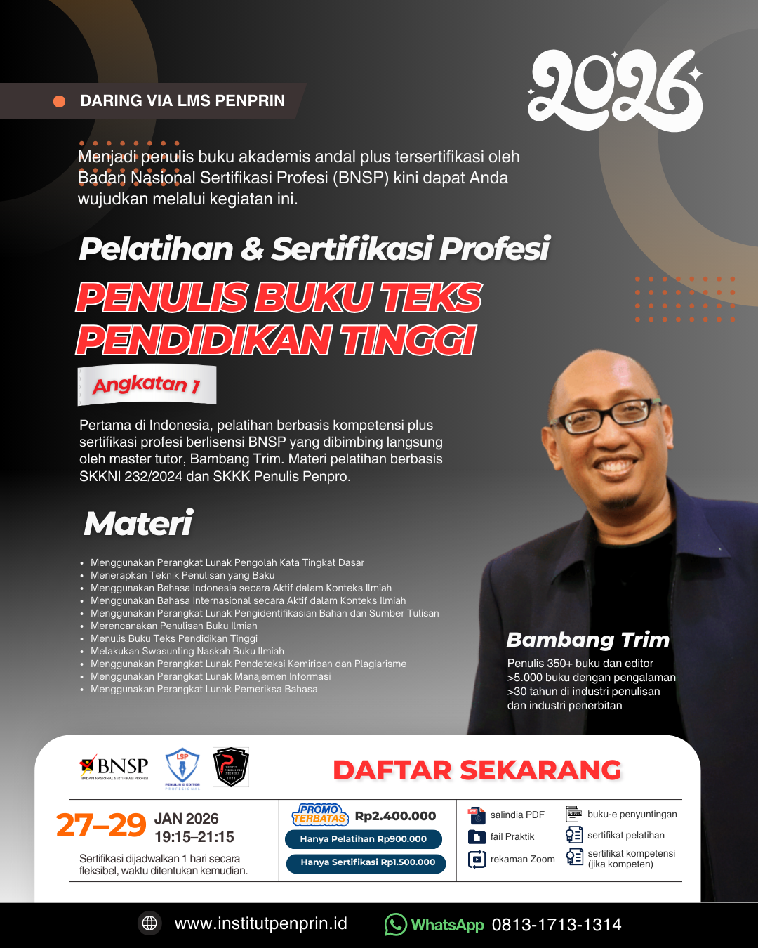 Institut Penprin mengadakan pelatihan berbasis kompetensi untuk penulis, editor, penelaah (reviewer), desainer buku, dan ilustrator buku. Berikut jadwal pelatihan yang diadakan oleh Institut Penprin. Anda dapat memilih untuk mengikuti pelatihan berdasarkan waktu terjadwal atau waktu nonjadwal—Anda yang menentukan waktu pelatihannya. Daftarkan diri Anda untuk mengikuti pelatihan berbasis kompetensi di Institut Penprin.