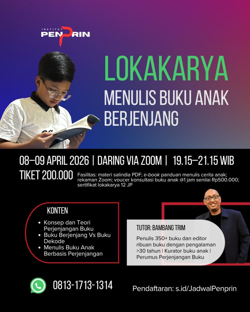 Institut Penprin kembali menghadirkan Master Tutor Bambang Trim untuk membedah tentang proses kreatif menulis buku anak berjenjang. Ia yang menjadi salah satu anggota tim penyusun Pedoman Perjenjangan Buku tentu akan berbagi informasi bernas untuk Anda semua. Konten yang akan dibawakan, antara lain konsep dan teori perjenjangan buku, uraian perbandingan antara buku berjenjang dan buku dekode, serta tips-tips menarik dalam menulis buku anak berbasis perjenjangan.