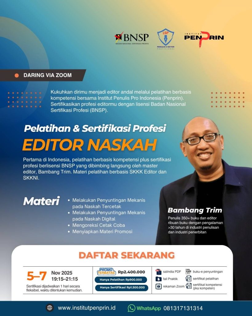Ini yang Anda cari wahai para editor naskah, pertama dan satu-satunya program Pelatihan dan Sertifikasi Kompetensi Editor Naskah Berlisensi BNSP. Selama tiga hari (5–7 November 2025), Anda akan disuguhi materi berbasis kompetensi tentang kepenyuntingan yang akan dipandu langsung oleh Master Tutor, Bambang Trim. Adapun sertifikasi kompetensi akan dilaksanakan secara daring oleh LSP Penulis dan Editor Profesional (PEP) pascapelatihan dengan waktu fleksibel.