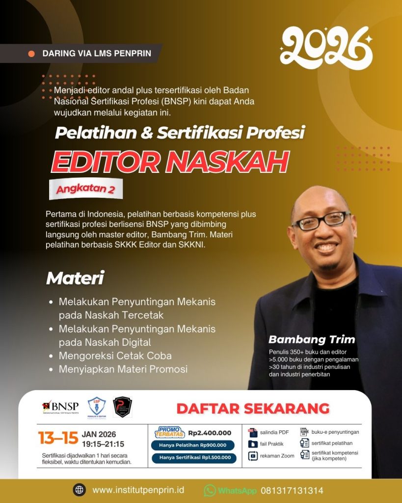 Ini pelatihan plus sertifikasi kompetensi Angkatan II untuk para editor naskah. Kami kembali menyelenggarakan satu-satunya program Pelatihan dan Sertifikasi Kompetensi Editor Naskah Berlisensi BNSP 2026 plus tepercaya. Selama tiga hari (13–15 Januari 2026), Anda akan disuguhi materi berbasis kompetensi tentang kepenyuntingan yang akan dipandu langsung oleh Master Tutor, Bambang Trim. Sertifikasi kompetensi/uji kompetensi akan dilaksanakan secara daring oleh LSP Penulis dan Editor Profesional (PEP) pascapelatihan dengan waktu fleksibel.