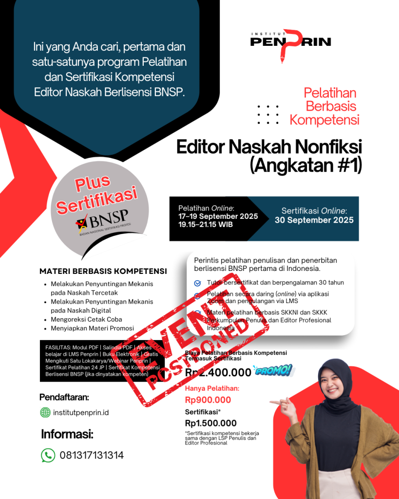 Ini yang Anda cari, pertama dan satu-satunya program Pelatihan dan Sertifikasi Kompetensi Editor Naskah Berlisensi BNSP. Selama tiga hari (17–19 September 2025), Anda akan disuguhi materi berbasis kompetensi tentang kepenyuntingan yang akan dipandu langsung oleh Master Tutor Bambang Trim. Adapun sertifikasi kompetensi akan dilaksanakan oleh LSP Penulis dan Editor Profesional (PEP) setelah selesai pelatihan (maksimal pada 30 September 2025).