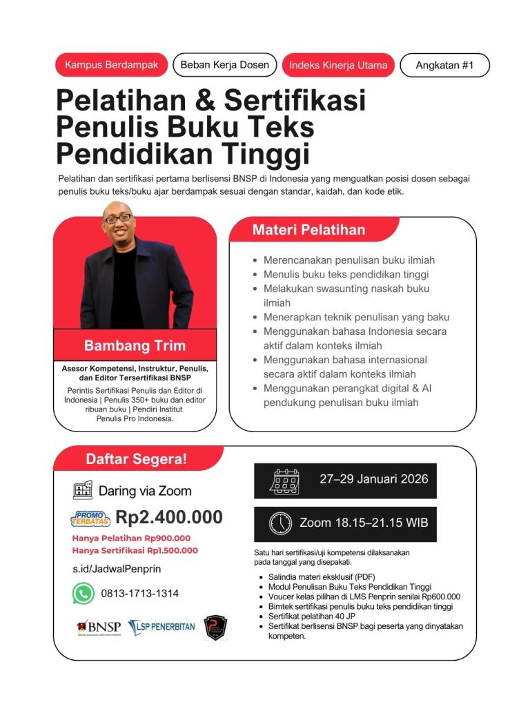 Pertama di Indonesia, pelatihan berbasis kompetensi plus sertifikasi profesi untuk para penulis buku teks pendidikan tinggi (angkatan pertama). Kami kembali menyelenggarakan satu-satunya program Pelatihan dan Sertifikasi Kompetensi Penulis Buku Teks Pendidikan Tinggi berlisensi BNSP 2026. Selama tiga hari (27–29 Januari 2026), Anda akan disuguhi materi berbasis kompetensi yang akan dipandu langsung oleh Master Tutor, Bambang Trim. Sertifikasi kompetensi/uji kompetensi akan dilaksanakan secara daring oleh LSP Penerbitan pascapelatihan dengan waktu fleksibel.
